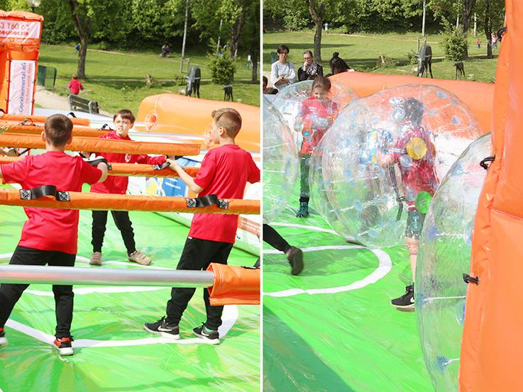 Grundsätzlich kann das CARITIVA-Spielgerät auch indoor genutzt werden. Die Maße 12 mal 6 Meter sind groß genug für jede Menge Teamspaß und klein genug, damit sie beispielsweise in eine Sporthalle passen. Im Bubble Kicker können gleich zwei Varianten gespielt werden, denn er ist Menschenkicker als lebensgroße Tischkicker-Version und Bubble-Ball-Arena als Kicker-Spaß mit aufblasbaren Airbags für die Spielenden in einem. Und „ganz normal“ kicken kann man darin natürlich auch noch. Alle Bestandteile werden im praktischen Anhänger geliefert, wo sie auch aufbewahrt werden – und einfach ausgeliehen werden können.