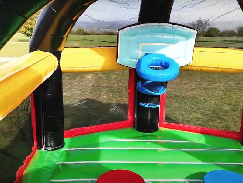 Die Basketball-Arena verknüpft den Spaß einer klassischen Hüpfburg mit der spannenden Korbjagd beim Basketball. Ganz schnell ist die 11 Meter lange, 5 Meter breite und 4,5 Meter hohe Anlage aufgebaut – und dann kann es auch schon losgehen. Mit riesigen Sprüngen ist beinahe immer ein Ball im Korb.