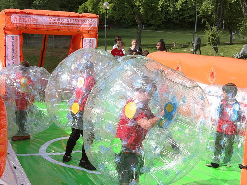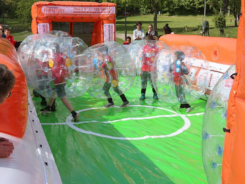 Der Bubble Kicker vereint den Spaß von gleich zwei tollen Spielen: Er ist Menschenkicker und Bubble Ball-Arena in einem. Das Äußere ist gleich, die Spielvarianten unterschiedlich. Entweder werden die Kickerstangen eingezogen und das Spielgerät wird als Menschenkicker genutzt. Oder die Stangen bleiben draußen und die Kinder ziehen sich die Bubbles über und los geht’s. Das Spiel wird im Anhänger geliefert. Größe im aufgeblasenen Zustand: 12 Meter mal 6 Meter.