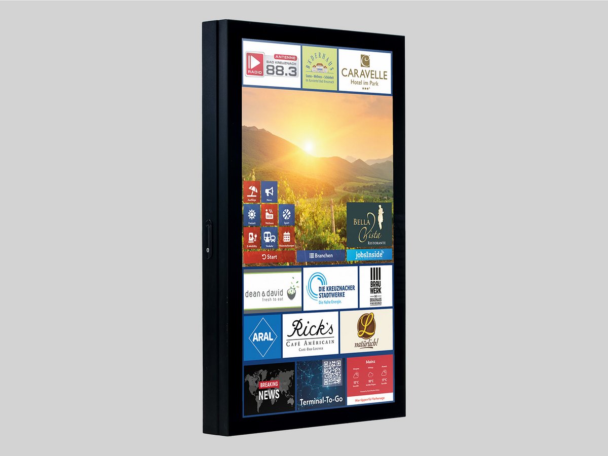 Dieses Gerät lässt sich nicht abschrecken: Es kann Hitze genauso gut abhaben wie Frost. Egal, was passiert: So lange Strom da ist, gibt es vom Outdoor Informationsterminal genau die Informationen, die Gäste benötigen. Es lässt sich nahezu überall anbringen und ist daher die ideale Lösung, wenn Informationen schnell und gut sichtbar bereitgestellt werden müssen. Das Outdoor Wand Terminal ist sowohl als Hoch- bzw. Querformat lieferbar.
